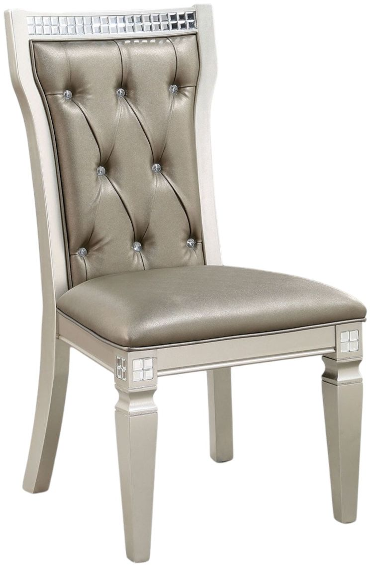 Shimmering from its tasteful mirror tile accents, this dining set proposes glam to any home that welcomes it. Find luxury in the padded leatherette seats with button tufting for the back and contoured for comfort. Light bounces beautifully off the subtle warmth of the finish, topping off this chic ensemble.Read More