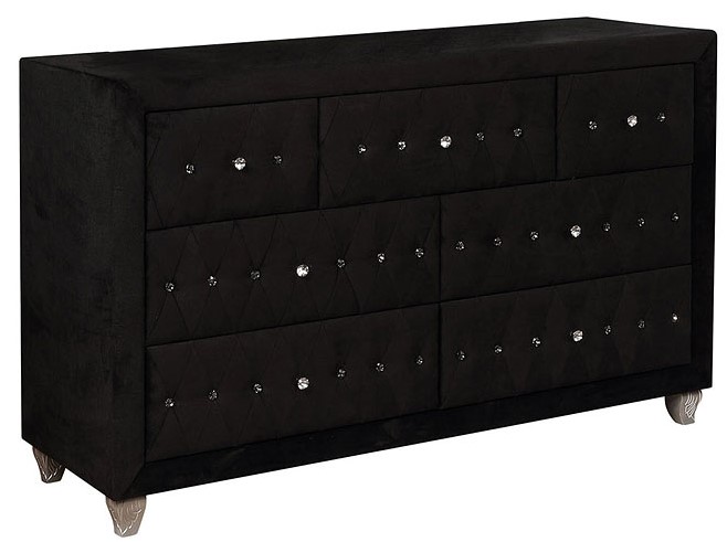 Comforting cushioned velvet-like fabric encompasses this dresser. Admire the glimmering acrylic button tufts, run your hands over the soothing fabric, and easily stock essentials in their cavernous storage drawers. Cabriole feet add a well polished finished as they provide unwavering support to this elegant piece.Read More