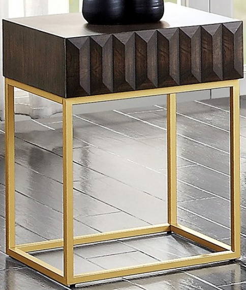A wooden frame and metal base come together for a trendy ensemble that will fit your contemporary space well. The matte gold finish is stand out here--the simple cube silhouette is striking in contrast to the deep walnut finish of the frame. The front panels feature a familiar pattern that conceals drawers with no visible hardware.Read More