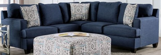 Accompanied with three plush accent pillows, this sectional offers a priceless chance to relax and unwind. Pair it with the matching ottoman in patterned, deep navy chenille fabric for a trendy centerpiece.