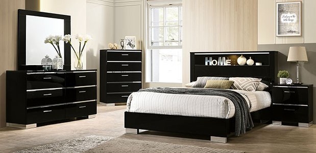 Sharp looks that can take over and define a room. This bedroom set brings a modern feel with a splash of alluring chrome accents that help it pop out. The bed frame maintains a minimal look but its headboard shelf gives you the perfect place to decorate and make it your own. The accompanying case goods maintain that same streamlined design while chrome accents and a high gloss lacquer finish complete the appearance.
