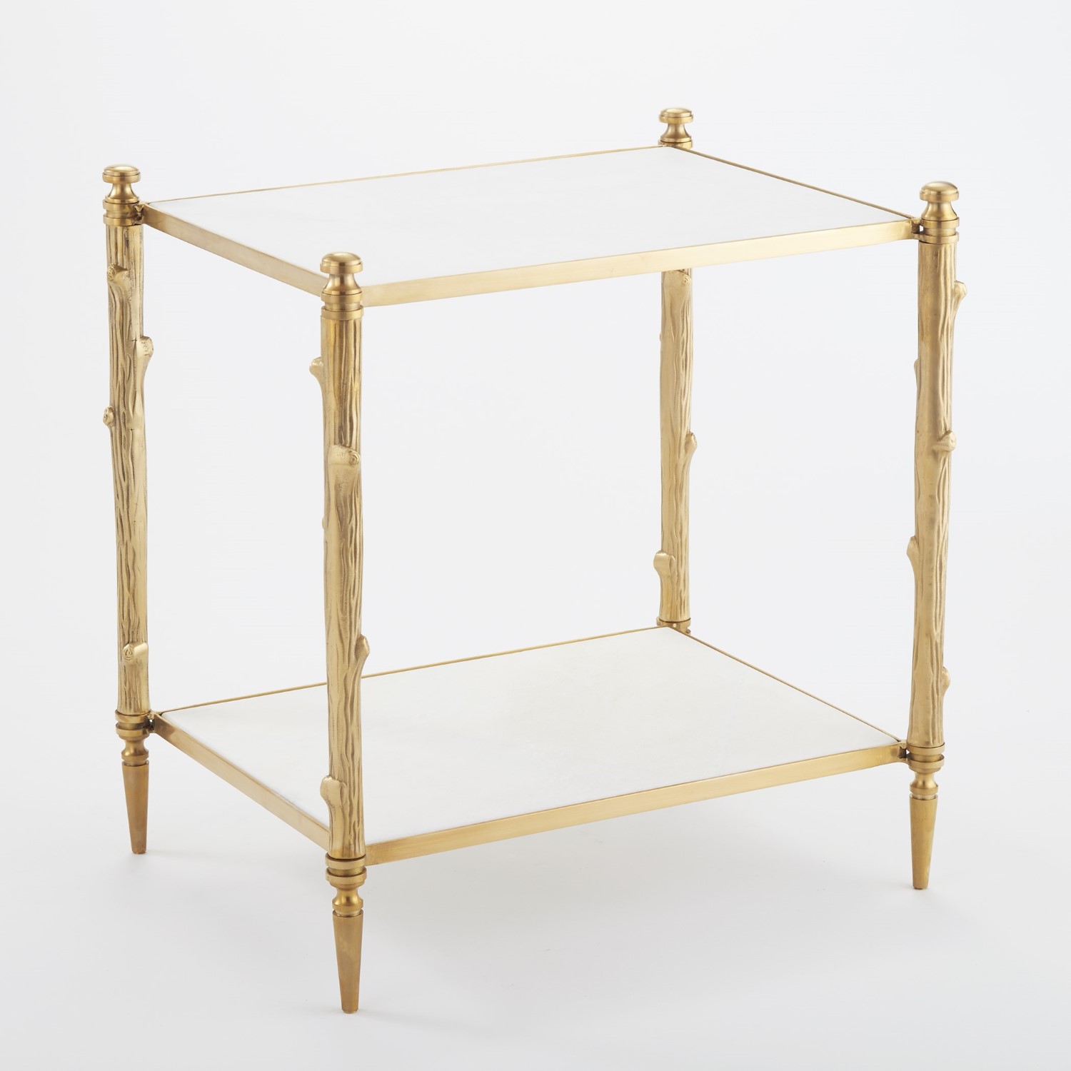 Referencing the natural world, this beautiful table has a twig textured brass frame with two stationary, white, honed marble shelves. The simple beauty of the materials shines through in this timeless design.Read More