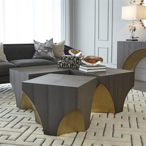 Our Arches Bunching Table is covered in dyed eucalyptus veneer. The cool grey tones are perfectly juxtaposed by the gold leaf accents on the base. Use just one as an accent table or use a group to create your own unique coffee table.Read More