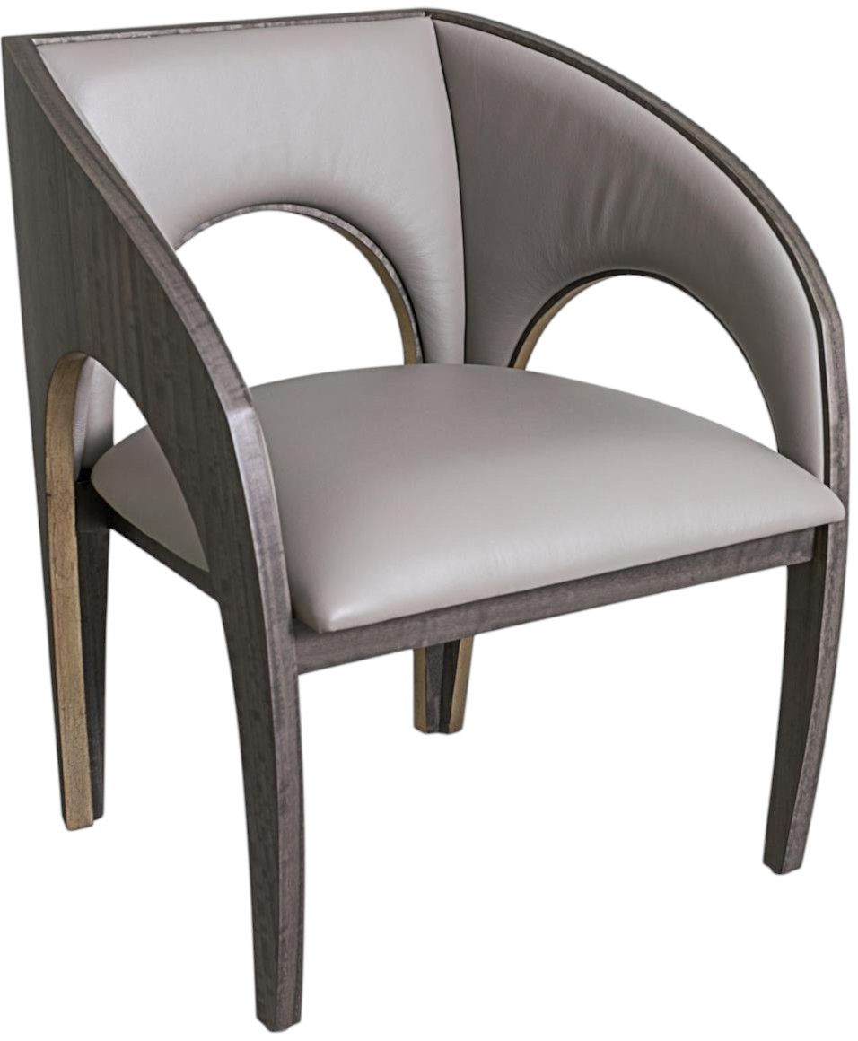 Our Arches Dining Chair is covered in luxurious leather with a dyed eucalyptus veneer frame. The cool grey tones are perfectly juxtaposed by the gold leaf accents.Read More