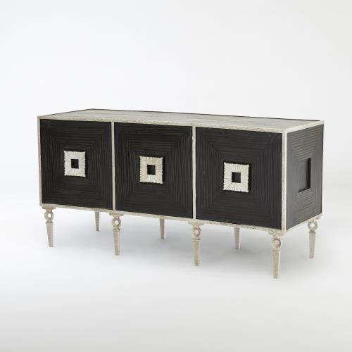 The Artisan Media Cabinet is solid hand carved wood with hand forged iron frame and details. There are two adjustable shelves behind each of the three doors. Open slat system back allows easy access to component wiring.Read More