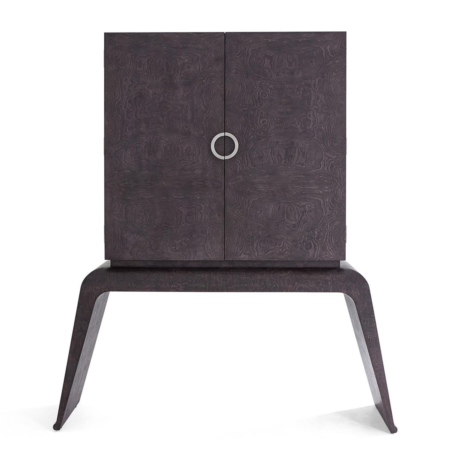 Our Baxter Bar Cabinet is form and function at it's finest. A solid wood case with expertly matched veneers, our signature gray stained finish, and solid satin nickel hardware make this unique design a head turner from first glance. Open up the doors to reveal 2 adjustable glass shelves, an eglomise mirrored back, three way touch light, two storage drawers, and a generous pull out tray for mixing the perfect cocktail at a moments notice.Read More