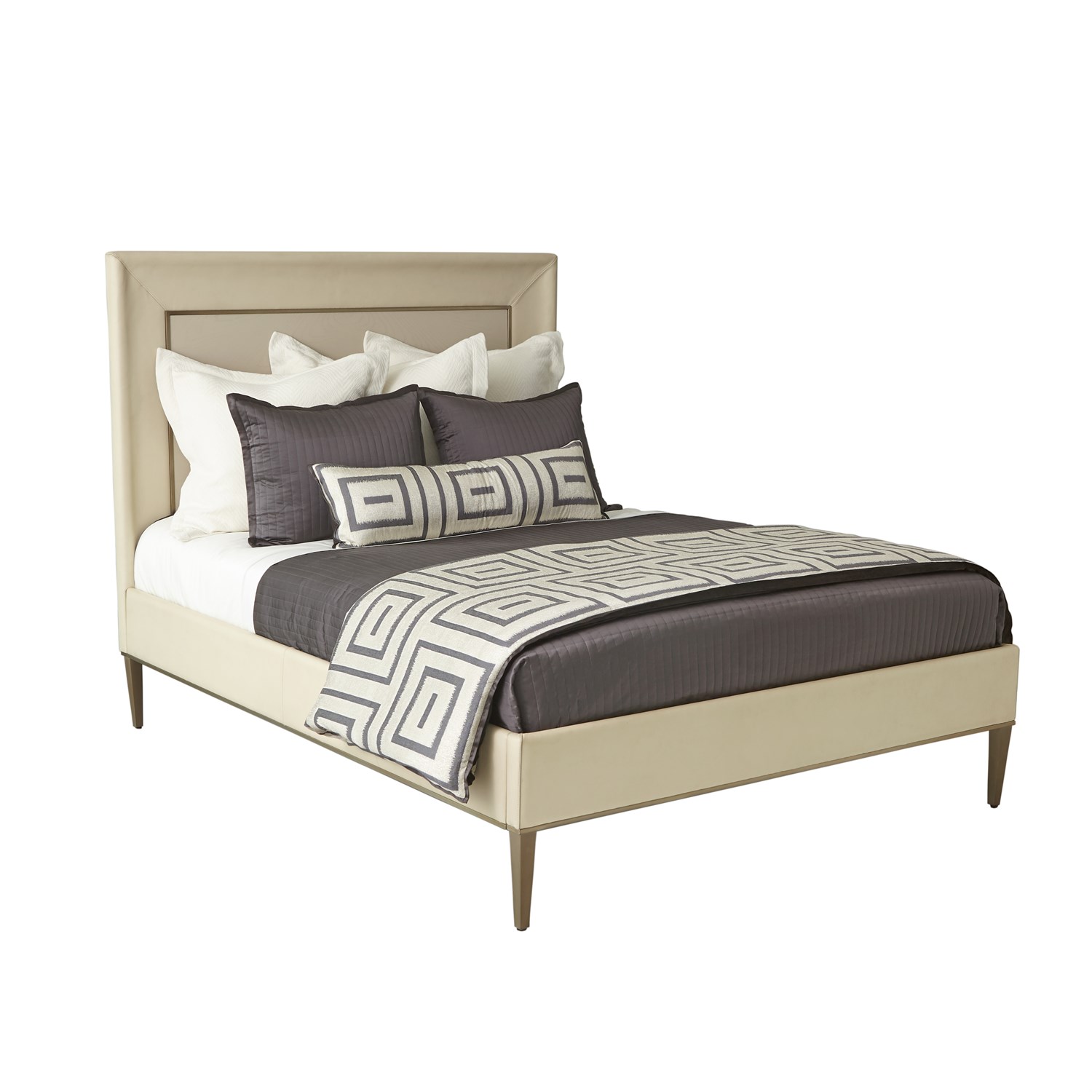 With gentle sweeping curves, our Ellipse Bed is covered in ivory leather and pewter metal finish with American white oak pie shaped veneer inserts creating a unique wood grain pattern. Headboard has a finished back so it can be positioned anywhere in a room. 5" box spring is recommended to achieve to the perfect mattress height.Read More