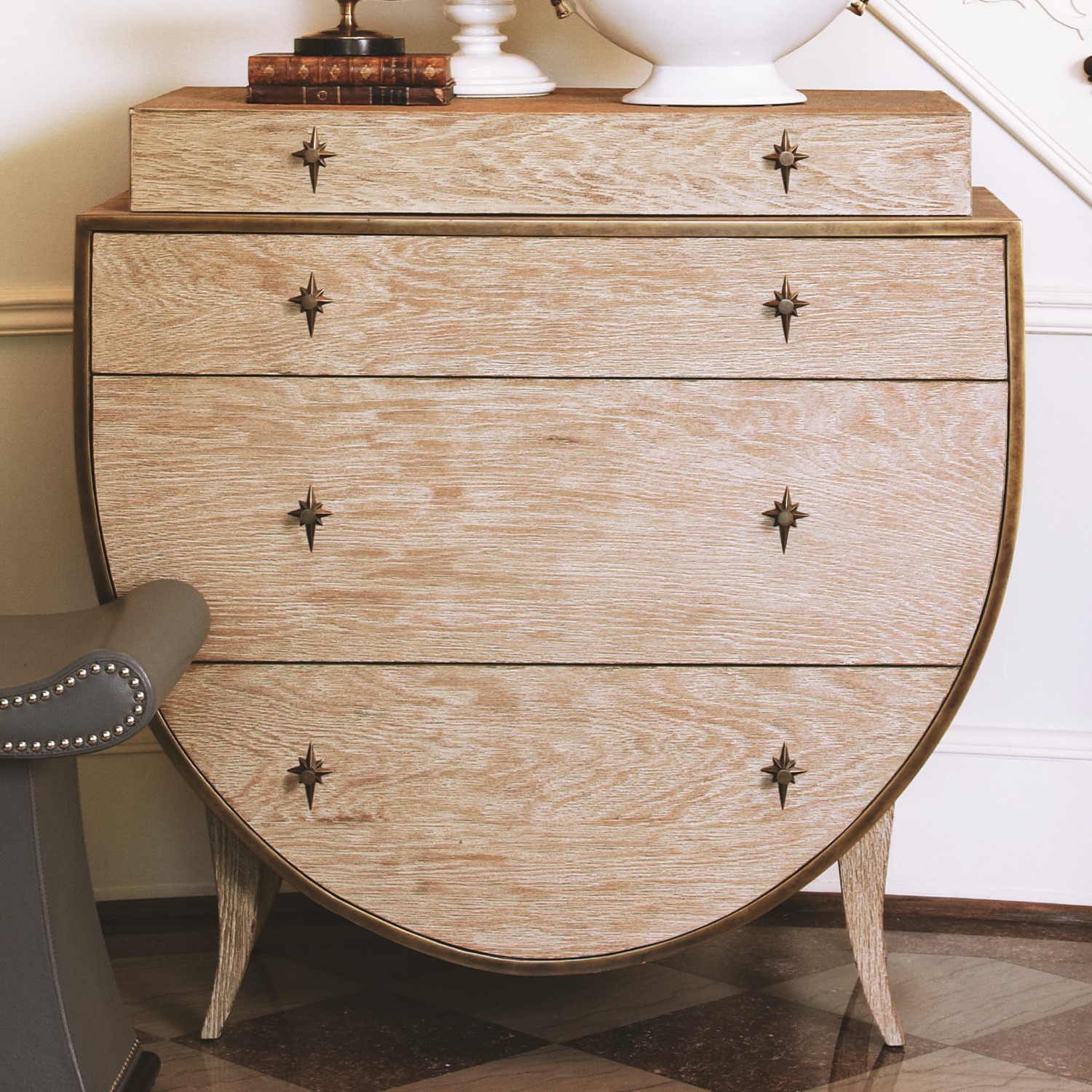 This beautiful curved shaped chest is solid American white oak in a unique sandblasted finish. It has 3 functioning drawers with a nonfunctional stepped-in "faux" drawer at the top. Each drawer has two solid brass in a bronzed finish pulls with a star shaped back plate. The cabinet is trimmed at top and bottom with golden bronze finished metal.Read More