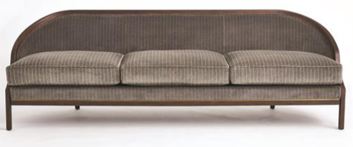 Tailored Sofa is distinguished by the sleek pinstripe fabric around the back support. A beautiful wooden base supports the sofa and is accentuated along the bottom edge with a filet of solid brass running around the entire frame of the sofa. Elegant shapely legs and frame are finished in a dark waxed oiled walnut finish.Read More