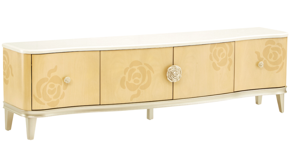 The Camellia Field caramel media cabinet features warm caramel finish and camellia marquetry on the doors are complemented by champagne gold accents, the signature camellia flower knobs, and a luxurious marble top. Behind its elegant design, this piece offers adjustable shelves, discreet wire management, and ample storage.Read More