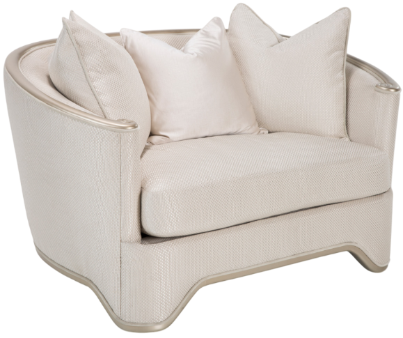 Chair cushion and body are upholstered in a champagne fabric the emulates raw woven silk
