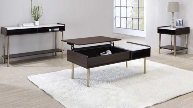 The classic look and feel of brown walnut and marble come together in this value-packed Lift-Top Table Set from the Carrie collection. Printed veneers deliver the Mid-Century Modern mixed media feel with a metal, wood and stone look that will style up a living room area in an instant. Combined with an End Table and Sofa Table this table set delivers Mid-Century Modern style to any room!Read More