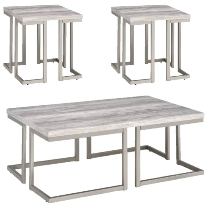 This 3‑piece occasional table set includes a cocktail table and two end tables, each featuring a gray finish top supported by a matte pewter base. The design blends wood and metal for durability and style, making it a versatile choice for living rooms.Read More