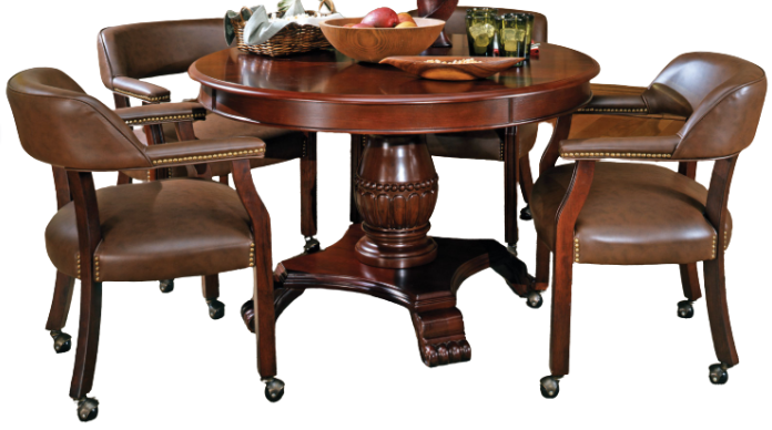Enjoy the dining night with this Tournament round dining table and four chairs. The 48-inch round table comes in a medium cherry finish and can accommodate four comfortably for dining. The chair features nailhead trim and rich cherry colored finish to work well for dining.Read More